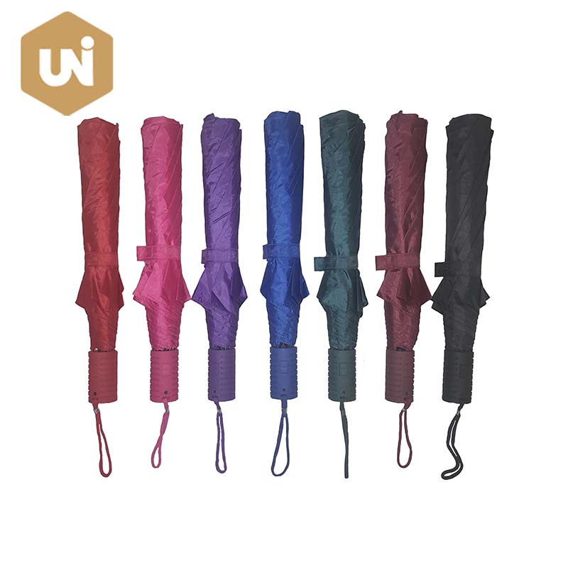 2 مظلة قابلة للطي أوتوماتيكية مفتوحة إطار من الألياف الزجاجية وعمود معدني، مقبض بلاستيكي بلون مطابق، مادة بوليستر صلبة |